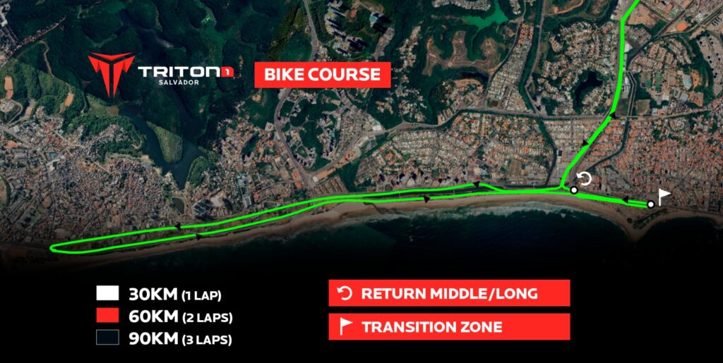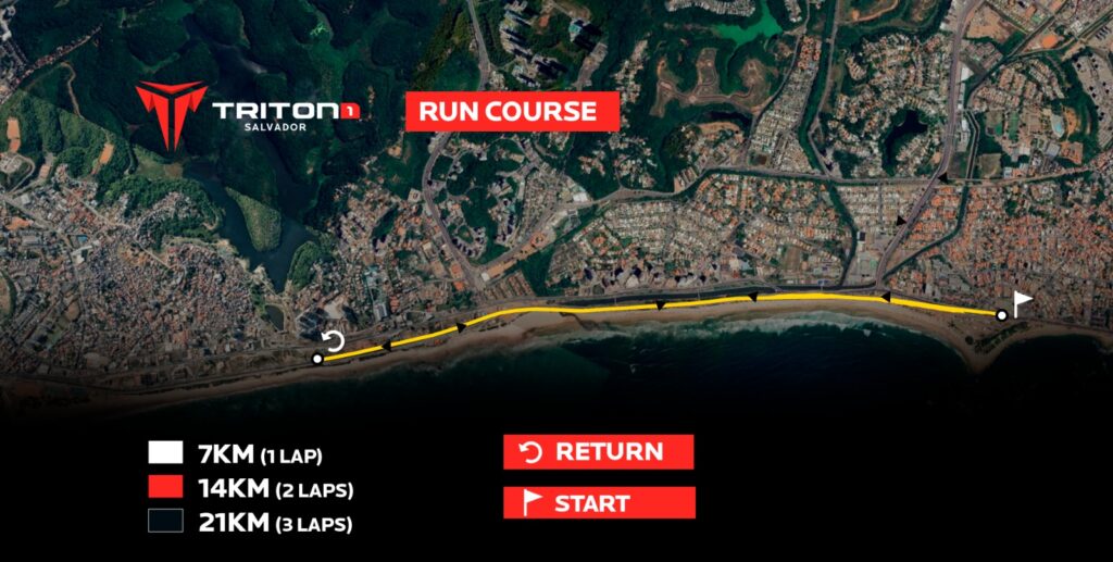 The run course starts at the transition zone located at Piatã Square, and it is absolutely flat. Each lap has about 7 km. The run course is very spectator-friendly, with tons of spectators along the entire course.