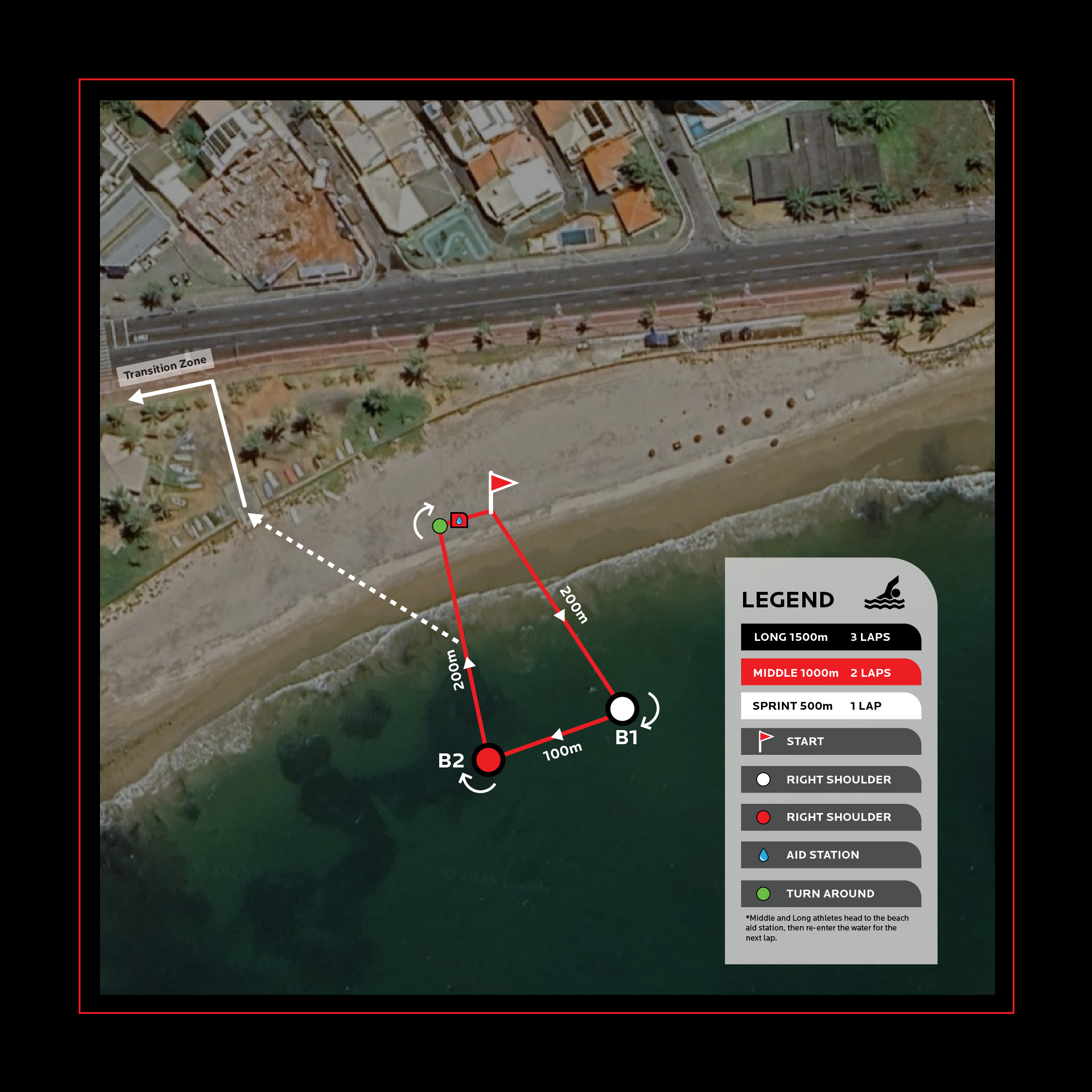 The swim takes place at Piatã Beach and the course starts under the TRITON arch set on the beach. The course is made up of 500 meter laps.