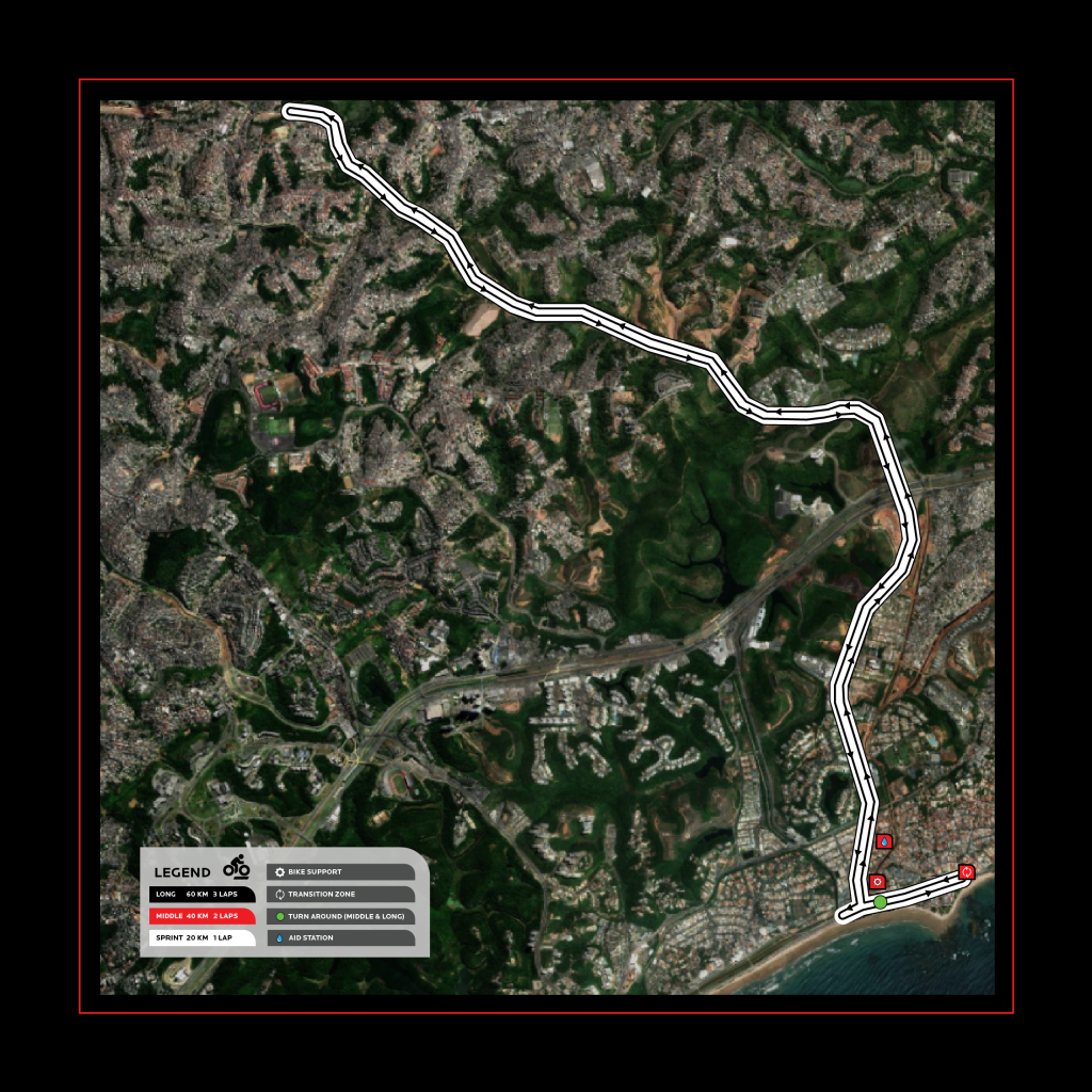 The bike course starts at Piatã Square, enters Av. Orlando Gomes and continues along Av. 29 de Março until Regional (turnaround).