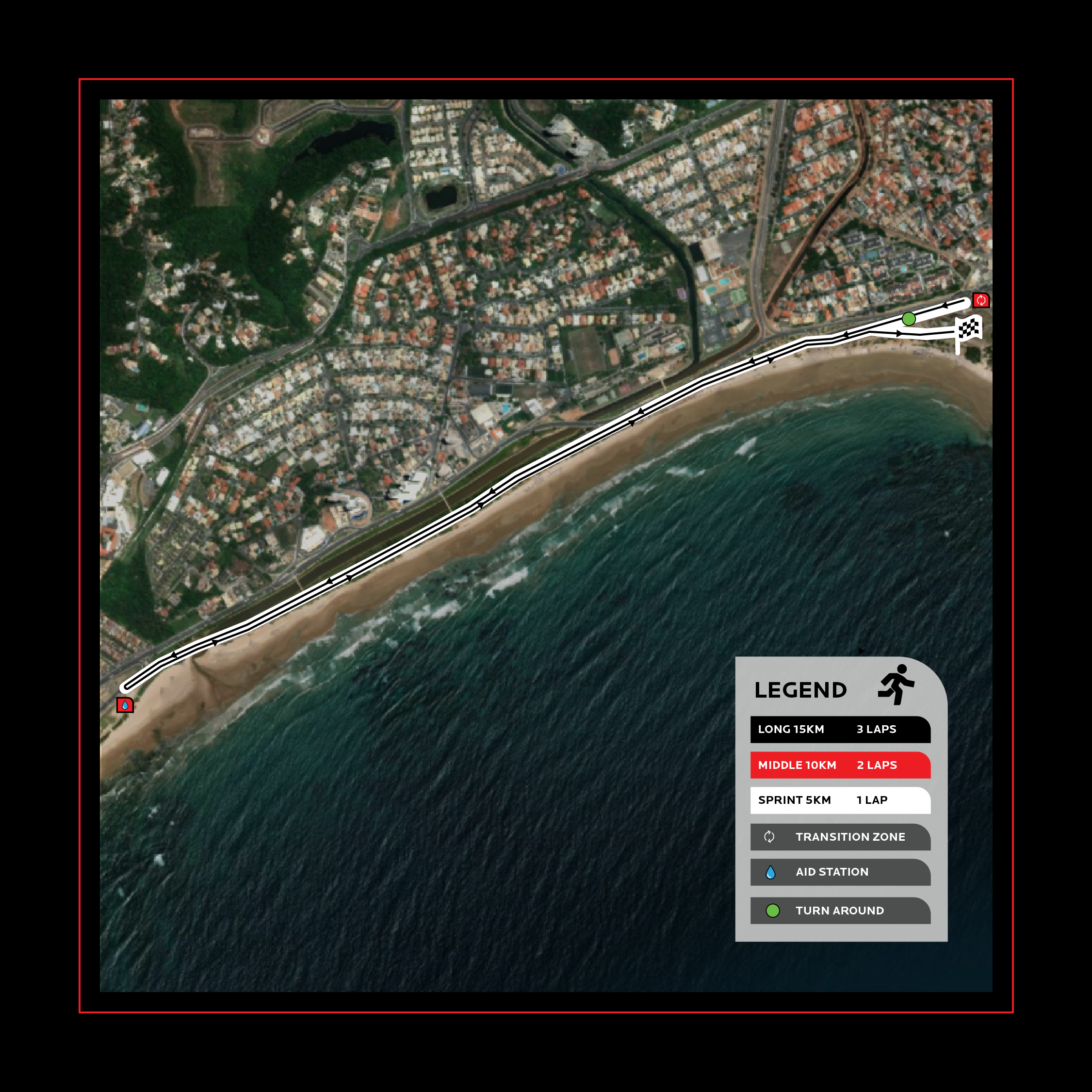 The run course starts at the transition zone in Piatã Square and heads toward Salvador Beach Club, following the entire beachfront.